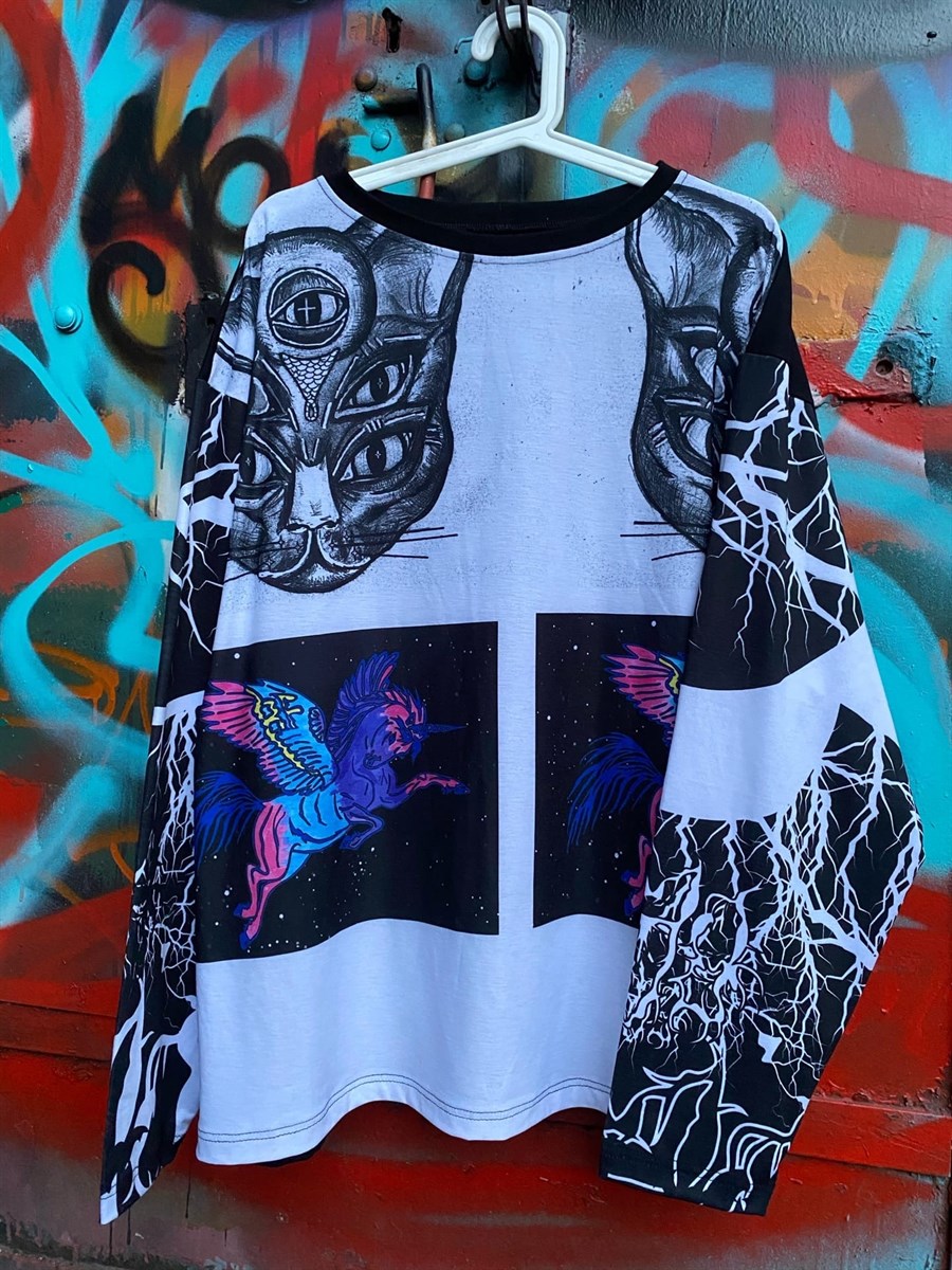 Авторский дизайн. Авторское лекало BF . Авторский принт.Скин - яркий аниме коллаж. В таком классно ехать под фонк летней ночью в папином кабрике за друзьями. Rich Wich и другие принты из вселенной BF . Отстрочка швов придаёт лонгсливу визуальной добротности. Приспущенная линия плеч. Вечные рисунки - при соблюдении правил ухода, не стираются.Пошив из такни Джерси, состоящей из: на 65% - вискоза – интересный материал из натуральной целлюлозы, отвечает за умеренную шелковистость; 30% нейлона – придают крепости материалу и отводят естественные испарения тела; 5% лайкры – придают эластичности этому лонгсливу. Сделано в Санкт Петербурге.